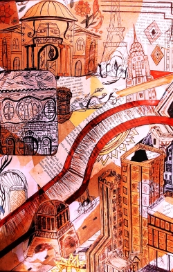 In regards to the foregrounds produced, a combination of mark-making and hatching techniques with black fine-liner pens were applied, in order to create intricate details within the subject matter, main figures /or main objects. This simultaneously helped to create contrast against the illusive and multi-layered backgrounds, which contained elements of collage.